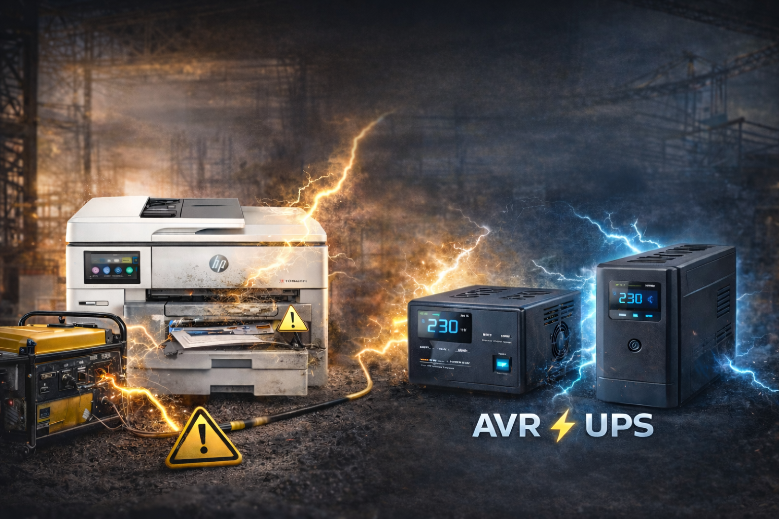خلال هذه الدقائق القليلة سنعرض لك معلومة فنية مهمة قد توفر على شركتك آلاف الريالات من تكاليف أعطال آلات التصوير والطابعات في مواقع المشاريع، وهي مشكلة تتكرر كثيراً في الشركات التي تعتمد على المولدات الكهربائية في مواقع البناء والمشاريع الهندسية.